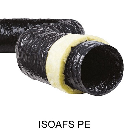ISOAFS-PE представляют собой теплоизолированные воздуховоды гибкие полиэтиленовые со спиральным каркасом из стальной проволоки, покрытые изоляцией из стекловолокна и полиэтиленового паронепроницаемого слоя.
